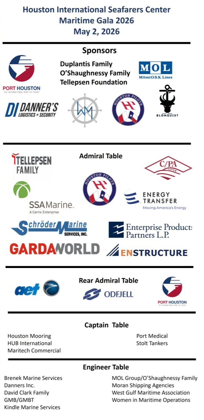The Seafarers Center Maritime Gala is the organization’s primary fundraising event and a premier networking opportunity within the maritime community. The Gala offers your company the opportunity to be showcased before more than 600 leaders from Houston’s maritime, energy, and logistics industries.